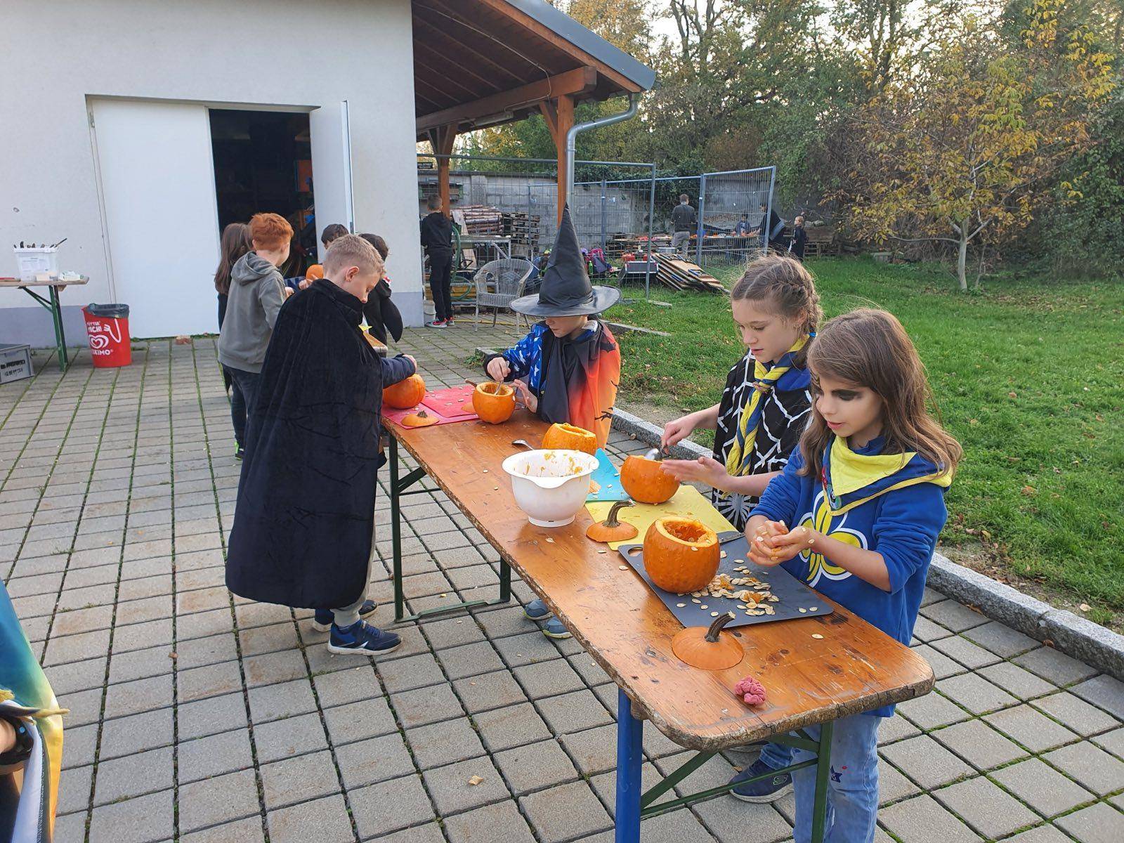 Wie jedes Jahr wurde auch heuer wieder gemeinsam gekocht. Die Kinder halfen fleißig mit und bereiteten eine große Portion Kürbissuppe zu. Während die Suppe langsam am Herd köchelte, schnitzten die WiWö ihre eigenen Kürbisse. Jedes Kind bekam dafür einen Kürbis und konnte selbst entscheiden, welches Gesicht oder Muster es hinein schnitzen wollte. Am Ende gab es viele verschiedene Ergebnisse, die von grinsenden Gesichtern bis zu richtig gruseligen Fratzen reichten. Alle geschnitzten Kürbisse durften von den Kindern mit nach Hause genommen werden.