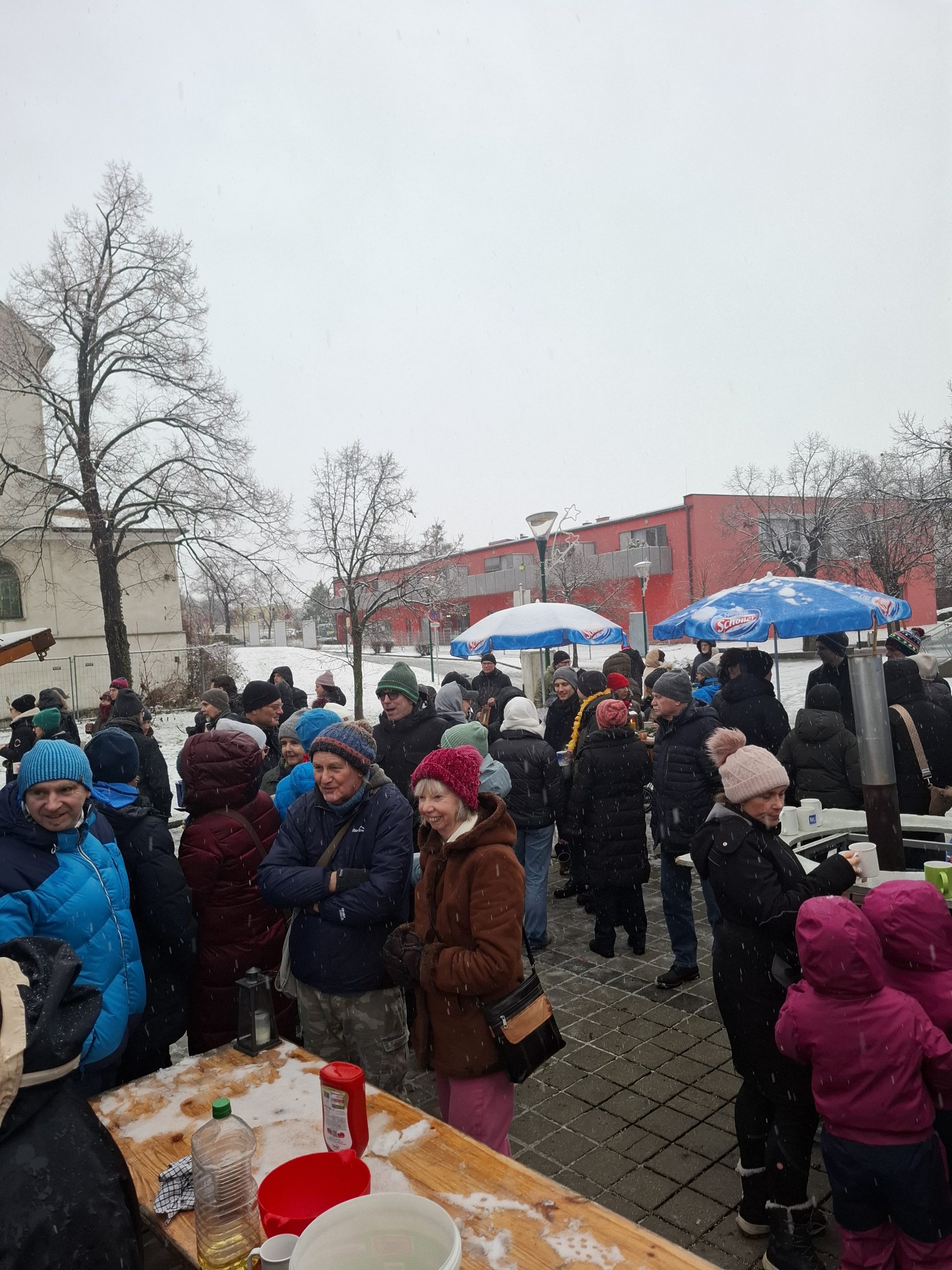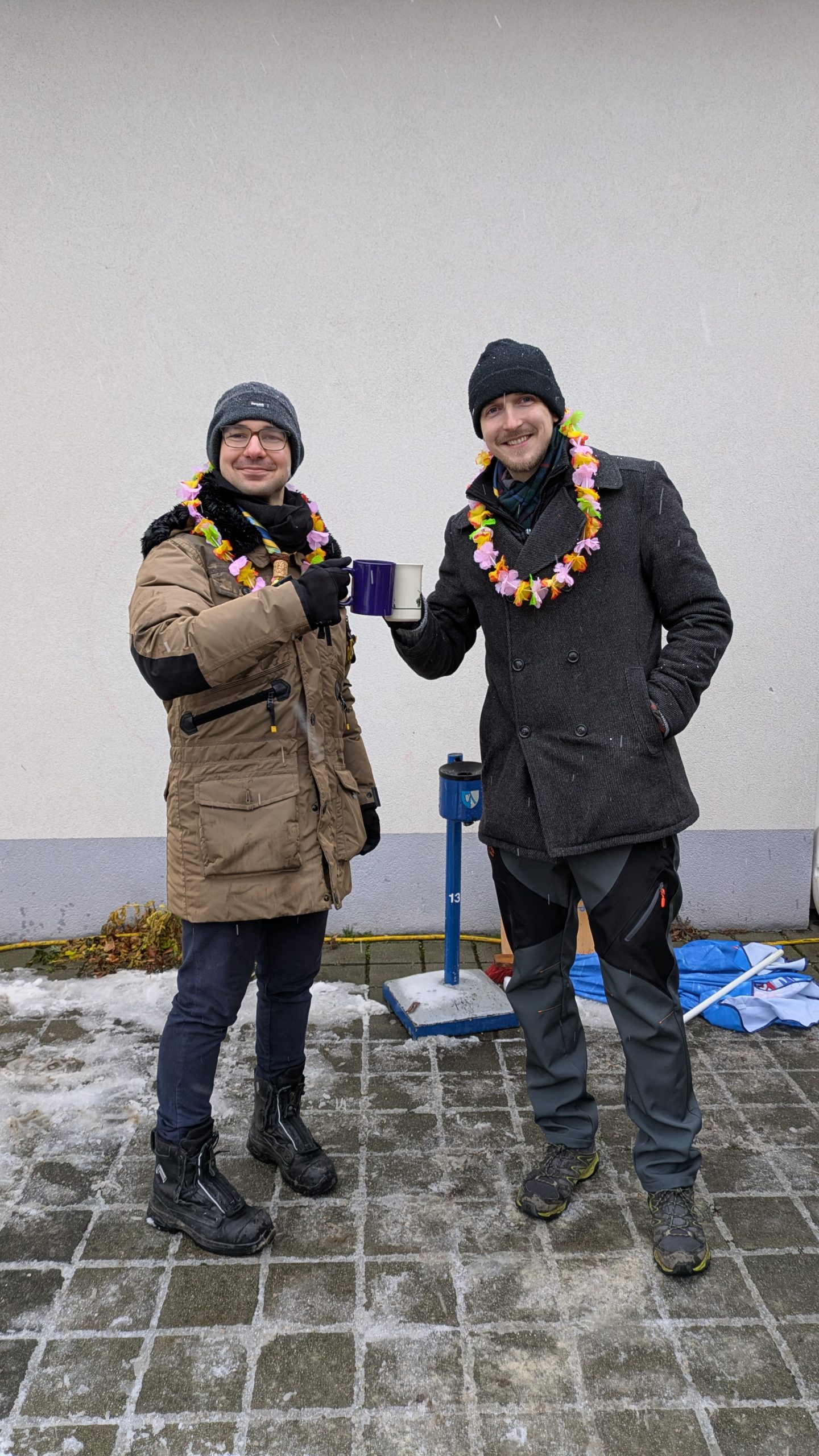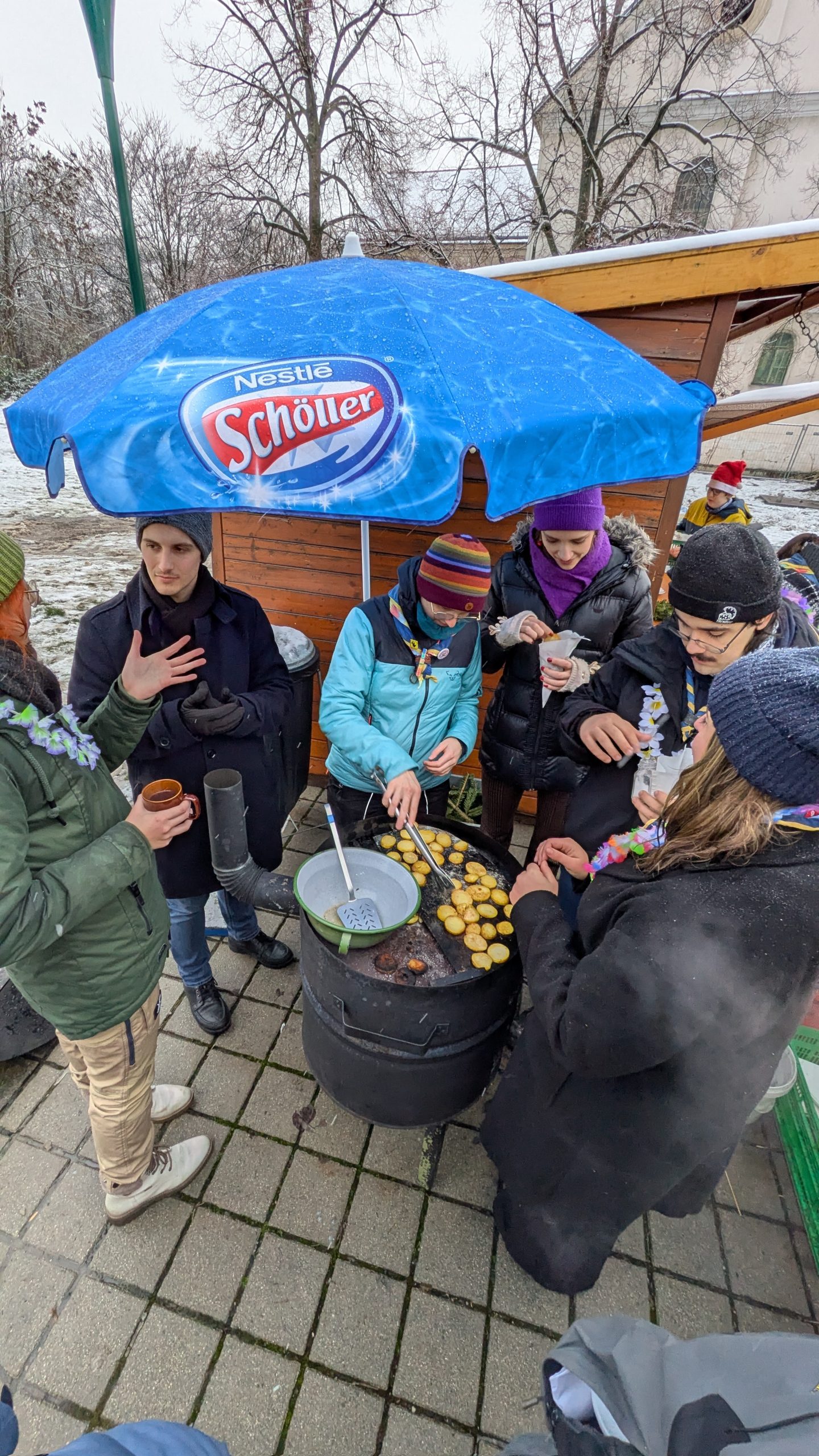 Und dann hat es geschneit. Weiße Weihnachten! In Niederösterreich! Zum ersten Mal seit 2012!! Wir konnten es auch nicht glauben. Zum Glück haben unsere Leiter*innen fix Sonnenschirme als Schneeschutz aufgestellt. Und weil Sebi und Fabia fanden, dass wir das tropische Flair trotzdem nicht aufgeben sollten, gab es Hawaii-Ketten für alle Leiter*innen und RaRo. Dazu natürlich die obligatorischen Schirmchen und Strohhalme im Punsch.