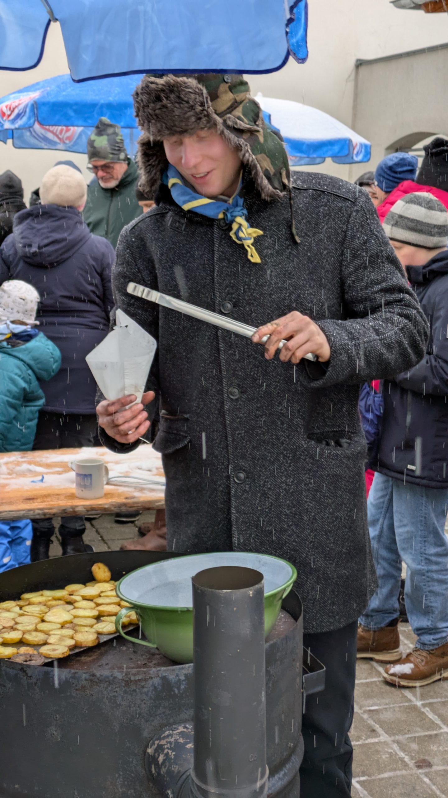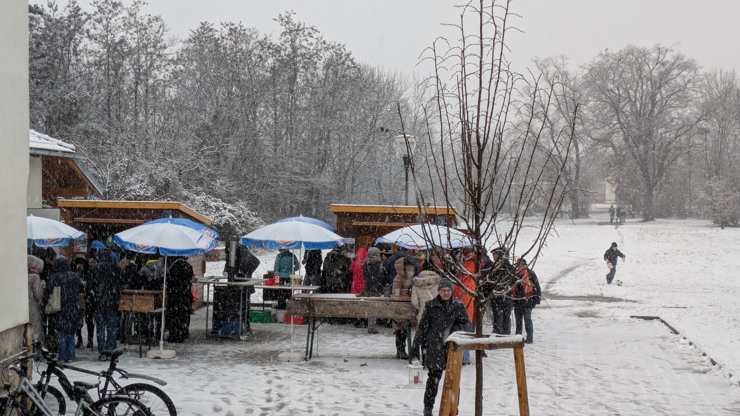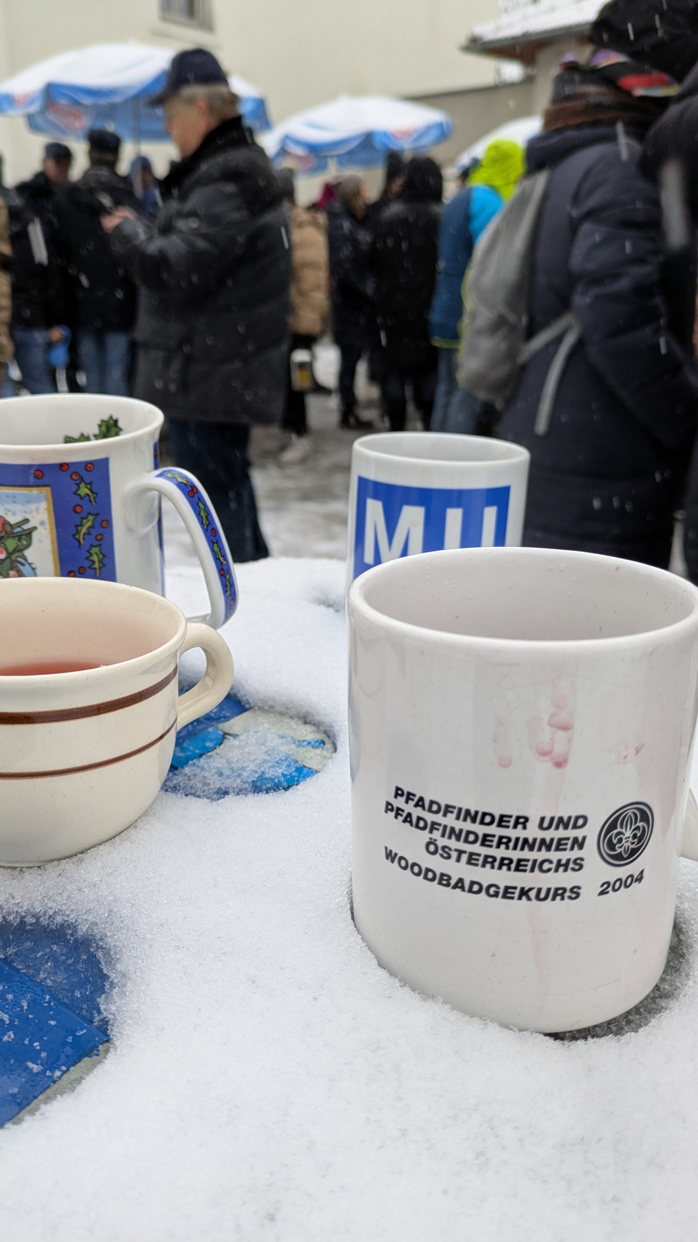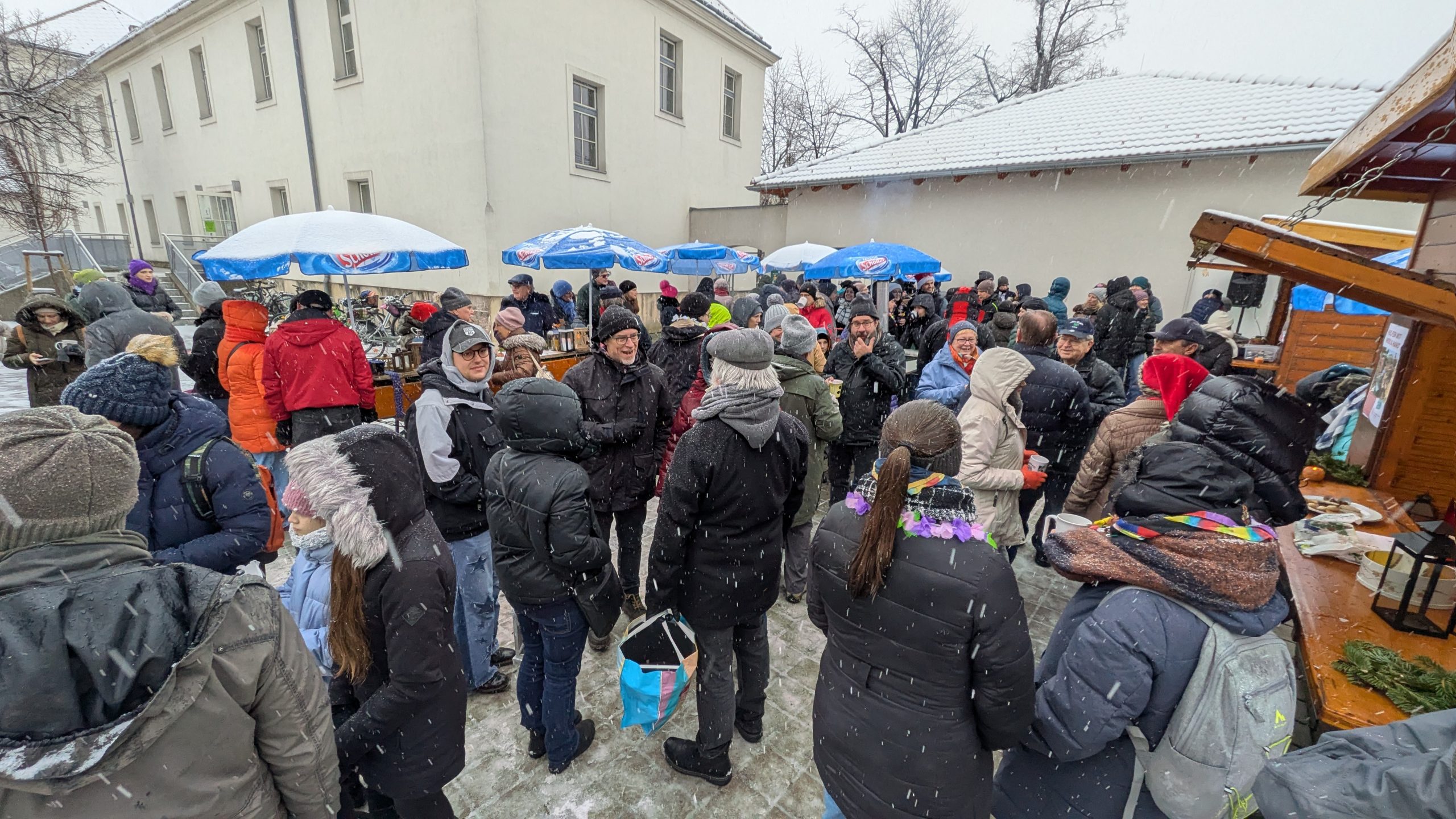 Und dann hat es geschneit. Weiße Weihnachten! In Niederösterreich! Zum ersten Mal seit 2012!! Wir konnten es auch nicht glauben. Zum Glück haben unsere Leiter*innen fix Sonnenschirme als Schneeschutz aufgestellt. Und weil Sebi und Fabia fanden, dass wir das tropische Flair trotzdem nicht aufgeben sollten, gab es Hawaii-Ketten für alle Leiter*innen und RaRo. Dazu natürlich die obligatorischen Schirmchen und Strohhalme im Punsch.